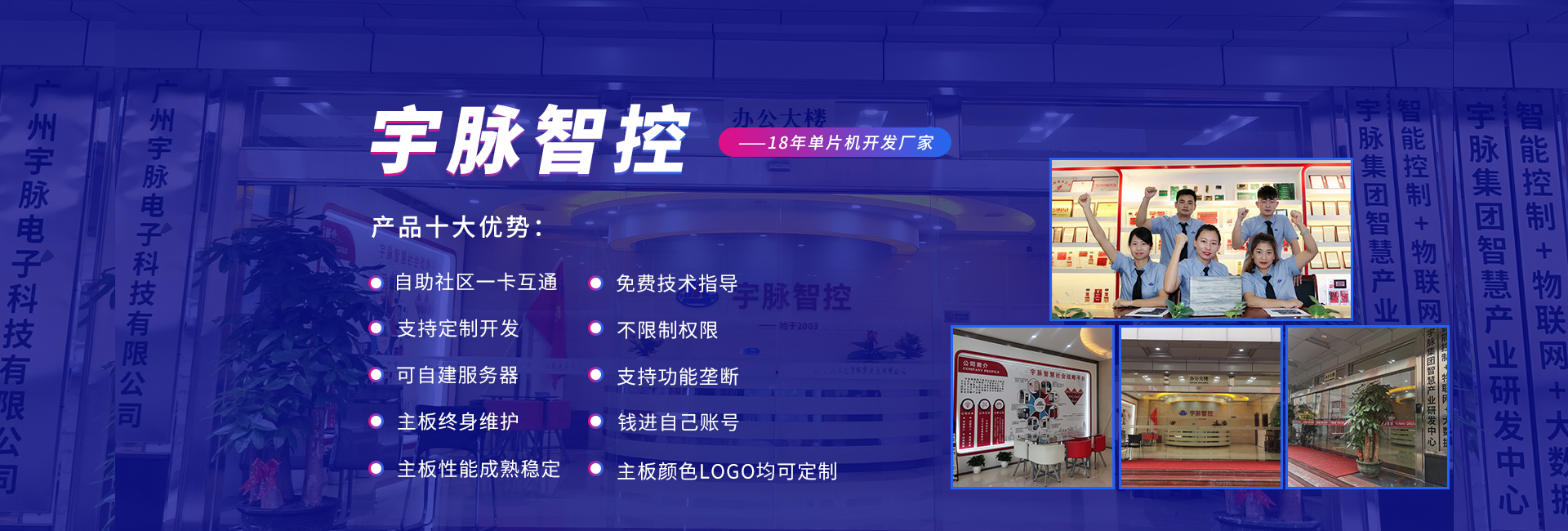公司前身是2003年成立的宇脈電子石牌經(jīng)營部,在廣州新賽格電子城擁有兩個(gè)實(shí)體店,專注于單片機(jī)開發(fā)、電子產(chǎn)品定制開發(fā)。2014年正式更名為廣州宇脈電子科技有限公司,專注打造無人值守自助設(shè)備控制系統(tǒng)及后臺管理系統(tǒng)方案定制的國家高新技術(shù)企業(yè)。并成為集研發(fā)、生產(chǎn)、銷售和服務(wù)于一體的領(lǐng)軍企業(yè)。